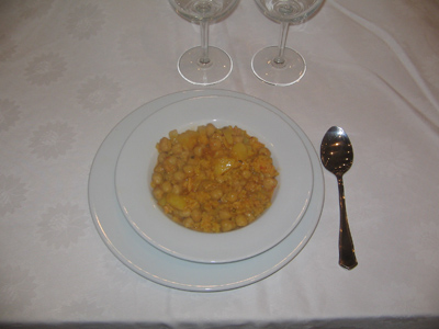 Este guiso combina productos de la tierra, como los garbanzos y el arroz, con los callos, obteniendo un plato muy nutritivo y económico.
