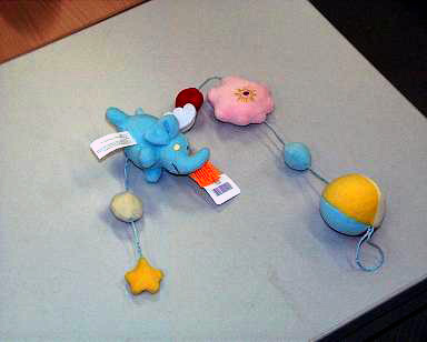 Juguete de coche suspendible, con siete figuras suaves (elefante, estrella, nube y cuatro bolas) suspendidas con una cuerda elástica. Origen: Desconocido.