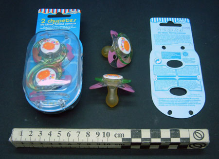 La tetina del chupete se rompió fácilmente durante la prueba de seguridad a la que fue sometida , quedando ésta en pedazos pequeños que podrían asfixiar a un bebé. Hay que tener en cuenta que el látex de caucho natural produce generalmente reacciones alérgicas en las personas sensibles a este material. La ausencia de esta indicación en la etiqueta podría dar lugar a que personas con este problema sufran reacciones alérgicas. Estos productos no cumplen los requisitos de las normas comunitarias.