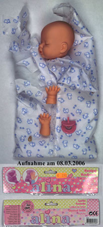 El producto presenta riesgo químico por los componentes plásticos que contiene, plastificante - 29,9 % de hexylphthalate diethyl (DEHP). El juguete plantea riesgo de estrangulamiento porque las manos y el maniquí de la marioneta, dados su tamaños, podrían ser tragados.