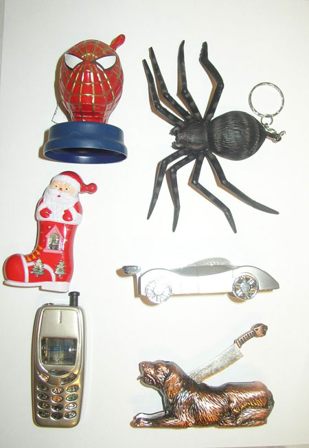 1. Máscara del hombre araña con efectos de iluminación, 2. Spider, 3. Cargador de Papá Noel con efectos de iluminación y melodía, 4. Coche de plata con efectos de iluminación, 5. Teléfono célular en color oro, 6.Brown con un cuchillo , 7. Ametralladora con efectos de iluminación y melodía, 8. Moto con jinete con efectos de iluminación, 9. Arma, 10. Arma, 11. Revólver, 12. Cabriolet rojo .