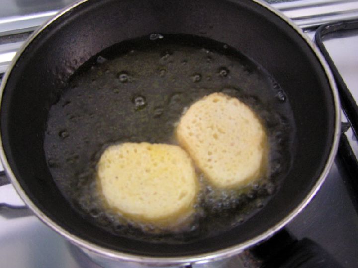 Cuando el pan ya está bien mojado, las rebanadas se van pasando por huevo batido y se fríen en aceite de oliva abundante, caliente pero no en exceso, pues el proceso de fritura es algo lento y debe evitarse que el huevo se queme.