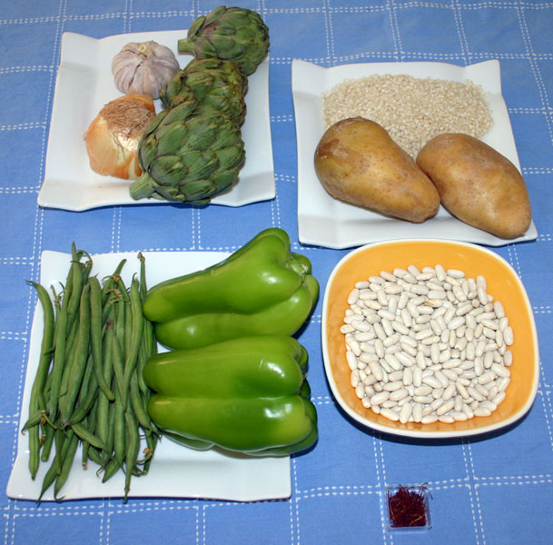 En otro recipiente sofreír unos dientes de ajo pelados, la cebolla pelada y cortada en trocitos, los pimientos cotados en trocitos y sin semillas, y las alcachofas cortados en trozos. Sofreír todo sin que las cebollas lleguen a dorarse del todo. A este sofrito se le agregan el pimentón y el azafrán de pelo para dar más sabor al mismo.