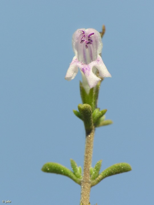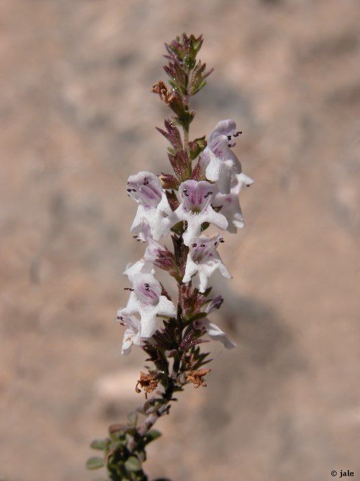 Pequeño arbustillo perenne, de hasta 50-70 cm de altura. Tallos muy ramificados e intrincados, numerosos y paralelos entre sí, que parten de cortos troncos de apenas 0,5-1 cm. de grosor. Hojas casi ovales, espatuladas, de extremo romo, cortas, 5-10 mm de longitud. Flores axilares, en grupos de 3-5, distribuidos a lo largo del tallo a modo de espiga. Corola bilabiada, de cinco piezas y tubo marcado, 6-7 mm., petalos rosado-blanquecinos. Frutos (2) 4, tipo núcula, en el interior de los cálices, persistentes en la fructificación.