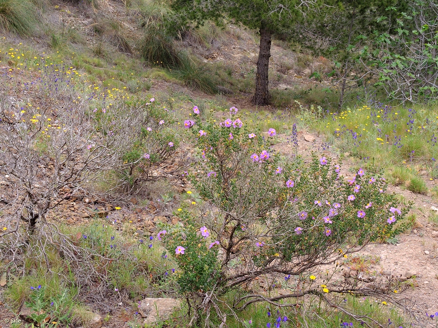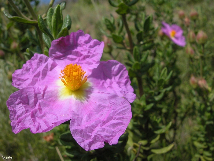 Arbusto de hasta 80-90 cm de altura, muy ramificado, sus ramas tienen pelos densos, estrellados, simples, glandulíferos. Las hojas superiores son sésiles y las inferiores pecioladas, generalmente elíptico-lanceoladas, tomentosas, con los márgenes ligeramente revolutos. Los pétalos, de hasta 25 mm de longitud, suelen ser de color rosado, con una mancha basal de color amarillo. El fruto en cápsula, de hasta 9 mm de longitud, tiene forma globosa; y sus semillas son tetraédricas, papilosas y de color parduzco.