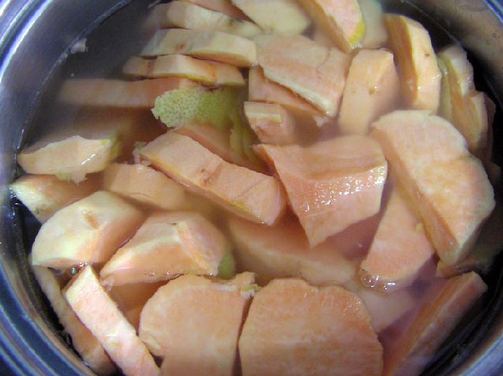 Como en cualquier compota o crema se debe cocer previamente el boniato, se puede cocer pelando y troceando las piezas o, después de lavarlas muy bien, cocerlas enteras y extraer la pulpa.