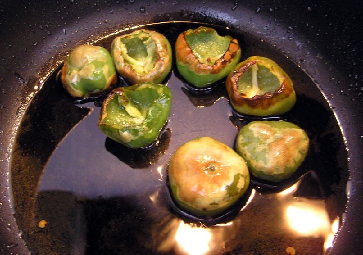 Se han de limpiar primeramente los pimientos de bola, vaciando el interior, y ya limpios se fríen en una sartén.