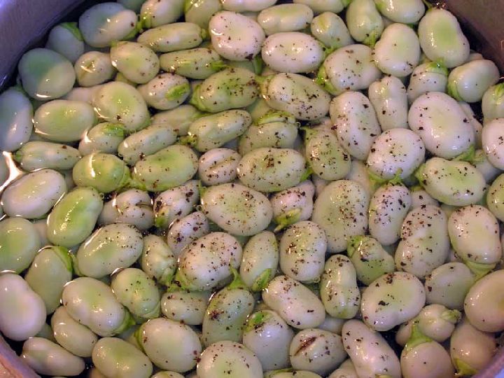 Después de extraer los granos de haba de sus vainas se dejan en una cacerola con agua, se han de echar con el agua fría que, inmediatamente, se pondrá a calentar, junto a la sal y la pimienta o, si se quiere, la guindilla.
