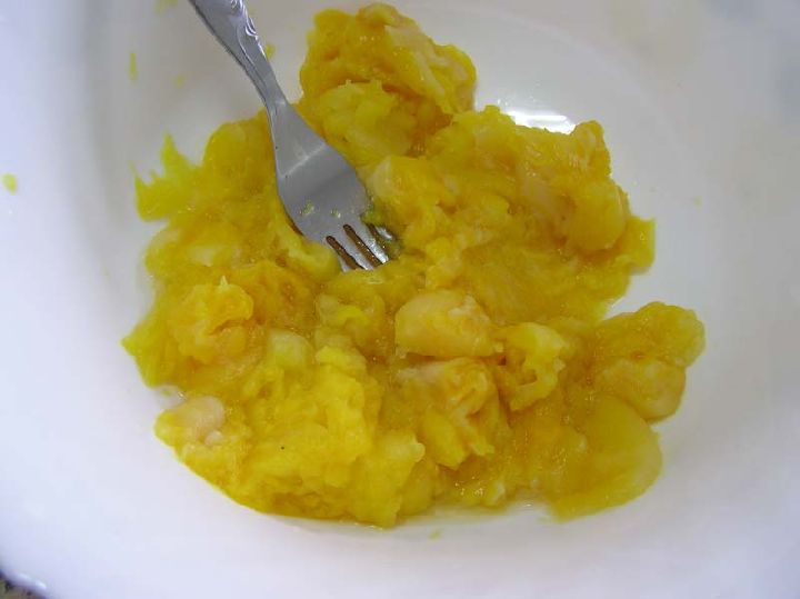Terminada de cocer la calabaza se escurrirá bien y se hará con ella un puré. A este puré se le añadirá el huevo, la leche y el azúcar. Cuando esta mezcla esté preparada se podrá ir añadiendo la harina.