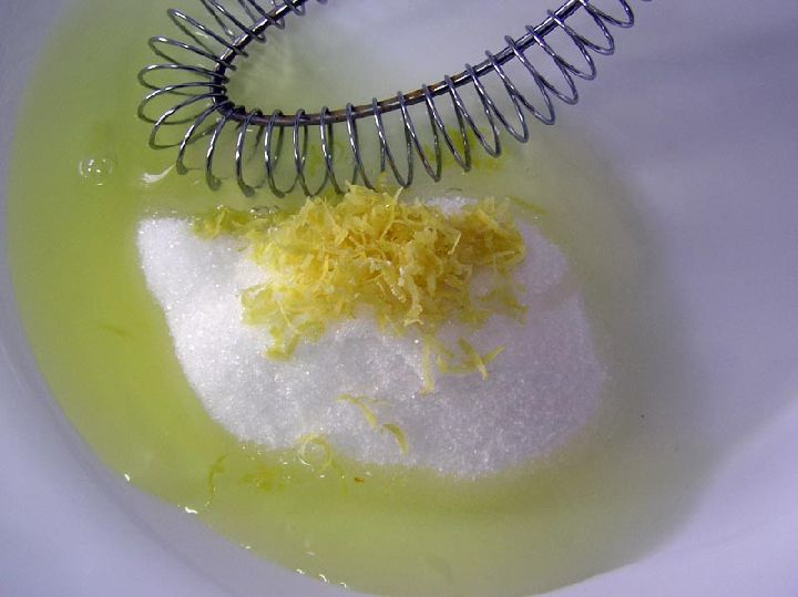 Se ponen en un recipiente las claras, el azúcar y las ralladuras de limón, batiéndolo todo. Seguidamente se incorpora la almendra y la harina de maíz y se vuelve a mezclar todo.