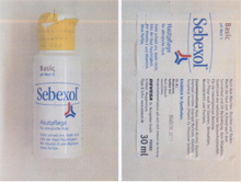 Loción para pieles alérgicas. Marca de fábrica: Sebexol básico, pH 5. Descripción: Frasco blando de plástico de 50 ml, 150 ml, 500 ml. Origen: Alemania