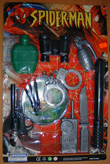 El set de juguete incluye: pistolas negras y marrones con la inscripción "N: 559", tres proyectiles con ventosa de succión, esposas, granada, cuchillo, radioteléfono, cantina, prismáticos y un blanco. El juguete se vende en una caja con la imagen de Spider-Man.