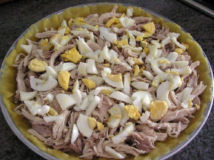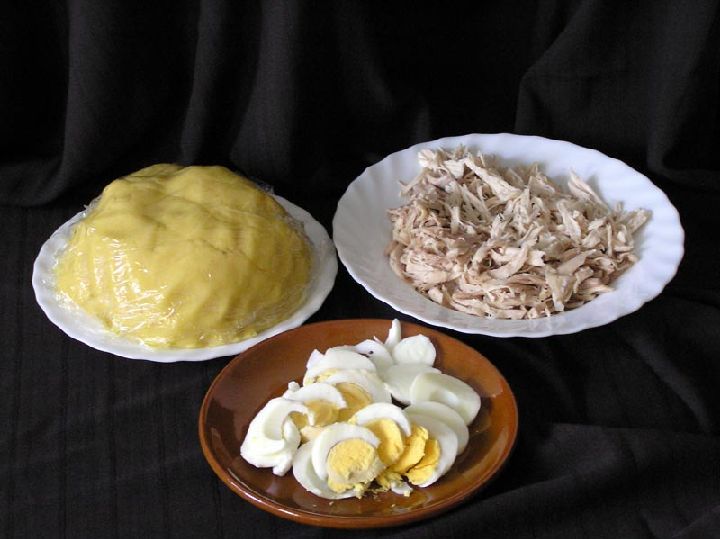 Se dejará reposar en el frigorífico la bola de masa. Mientras, preparamos el relleno de carne y huevo cocido. Del pollo sacaremos las mollas de carne, limpias de pieles y cartílagos, y los huevos los trocearemos.