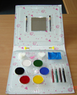 Descripción: Kit de pintura para la cara que incluye las advertencias "no conveniente a niños menores de 5 años" y "piezas pequeñas".