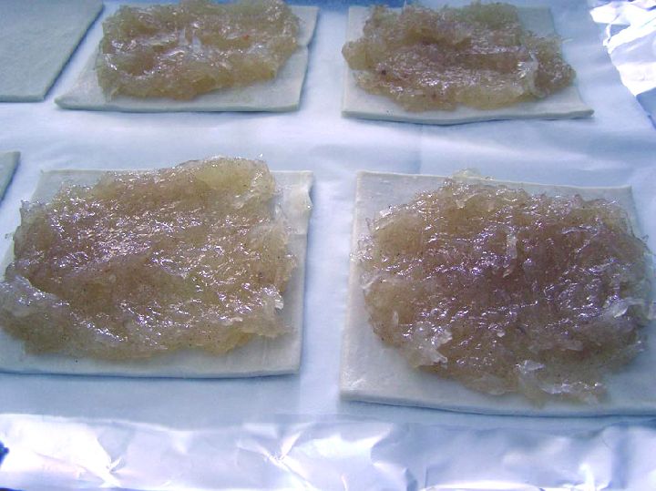 Para elaborar las costillas basta con cortar unas porciones de masa de hojaldre, dejar sobre ellas cabello de ángel, al que previamente se le mezcla un poco de canela, y tapar con similares porciones.