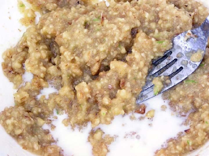 Las nueces deberán triturarse, un molinillo o una batidora eléctrica pueden sustituir perfectamente al tradicional molinillo manual de almendra. Dispuestas las nueces picadas en un bol habrá que añadir el resto de los ingredientes, los huevos, ya batidos, la raspadura de limón y la leche.