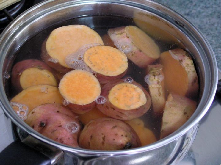 Los boniatos se lavarán y pondrán a cocer en agua. Si los cortamos la cocción será más rápida. Y una vez cocidos, despues de unos 20 minutos, los pelaremos y haremos con ellos un puré de boniato.