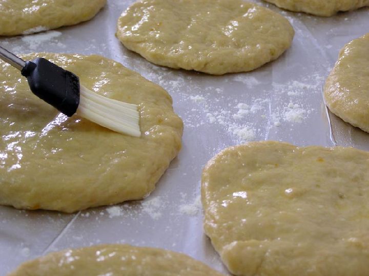 Como vemos, estas tortas no requieren ni de huevo ni de leche, pero sí de un poco de masa de creciente, una masa realizada con levadura prensada, agua y harina. Para hacer esta creciente sólo tendremos que mezclar la levadura con un poco de agua tibia y harina hasta conseguir una bola de masa que se dejará fermentar mientras preparamos el resto de elementos de las tortas.