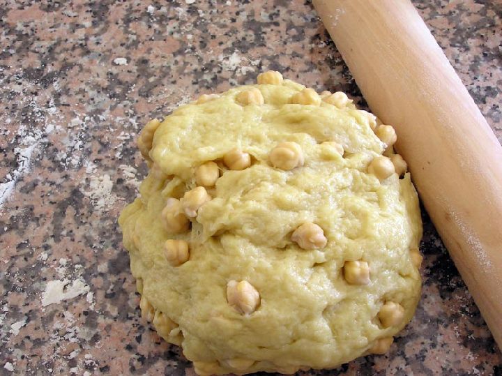 Después de tener toda una noche los garbanzos en remojo, con un poco de bicarbonato, nos dispondremos a preparar la masa de la torta. Podemos comprar un poco de masa de pan en una confitería (una barra de cuarto), pero es más divertido preparar un poco de masa de pan con agua, levadura prensada y harina. Disolvemos la levadura en el agua tibia y vamos echando harina hasta componer nuestra masa, sin olvidar la sal.