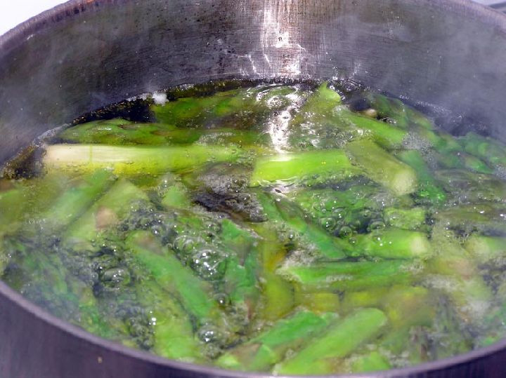 La elaboración es tan sencilla que es difícil poner pegas a esta receta. Partimos los espárragos, recordemos que hay que doblar el tallo hasta que por sí solo se parta, para eliminar las partes duras del mismo. Después lavaremos muy bien los espárragos y los trocearemos.