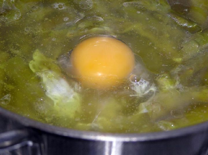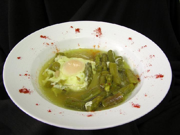 Las judías verdes con alcachofas, las alcachofas con huevo duro, la col cocida, la coliflor, las habas tiernas cocidas, etc. Cuando antiguamente los campos daban espontáneamente espárragos trigueros era frecuente que con ellos se preparara un hervido de espárragos con huevos escalfados. Hemos recuperado esta antigua receta de la Vega Media pero con espárragos verdes, un producto que está disponible todo el año en mercados y fruterías.