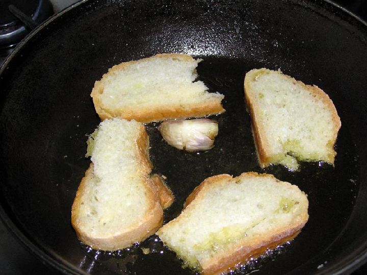 Las sopas de ajo llevan un proceso sencillo pero metódico. Primero, en una sartén con aceite se sofríe un diente de ajo (si es una ración). Se añaden unos trozos de pan, del día anterior, y se fríen con el ajo, como los croutons de una sopa o ensalada. Ajo y pan se apartan.