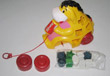 Descripción: Se trata de un juguete de plástico con 4 ruedas y una cuerda para tirar. Hay una etiqueta doblada de cartón con fotos de varios juguetes con su número. En el cartón las inscripciones: "QUICHENG", "Hecho en China", la restricción de edad (0-3), "marca CE" y las advertencias: "no apropiado para niños pequeños debido a las piezas pequeñas".
