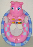 Descripción: Flotador inflable con forma de hipopótamo suavizado con PVC; nombre del producto y advertencias en varios idiomas; símbolo de edad de los niños y la marca «CE» en la parte de atrás.