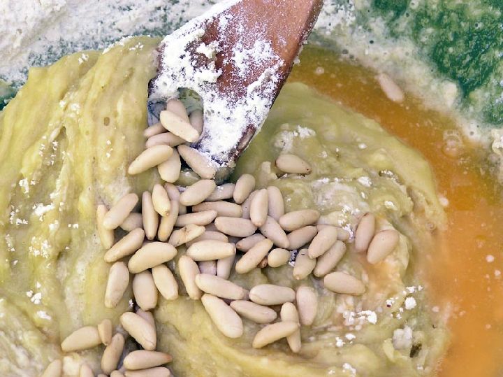 Mezclados los elemento grasos y líquidos sólo nos quedará añadir la levadura y la harina tamizada poco a poco, entonces amasaremos hasta conseguir una masa que pueda estirarse en una mesa para formar nuestros rollos. No olvidaremos los piñones, echando unos pocos a la masa mientras terminamos de amasar, no damos cantidades por ser un elemento que puede añadirse al gusto.
