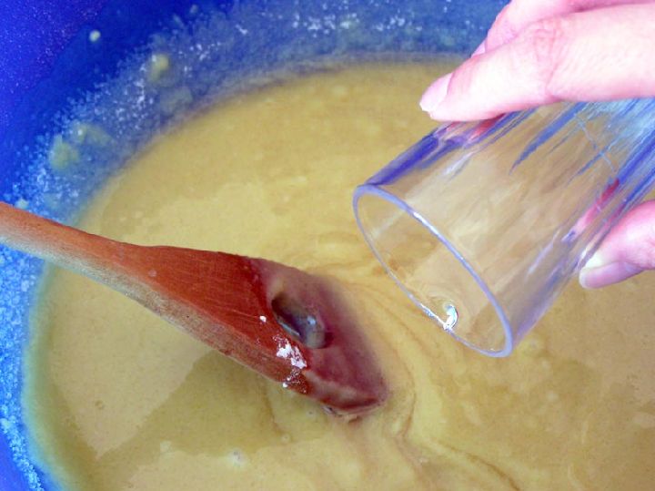Esta receta tiene una particularidad propia de muchos dulces navideños, especialmente mantecados, la harina debe escaldarse. Y la harina se escalda con el aceite caliente que hemos calentado con unas cortezas de limón. Colocada la harina en forma de volcán, verteremos el aceite caliente en el centro y comenzaremos a remover con una cuchara de palo.