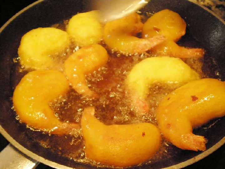 Una vez tengamos la gamba preparada sólo nos falta introducirlas en nuestro batido y freírlas.