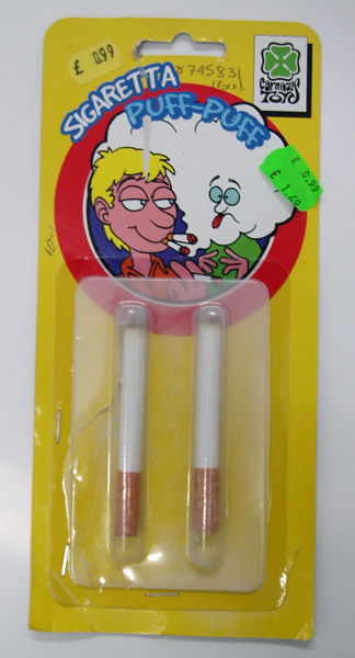 Presenta un riesgo químico por la posible inhalación de los polvos de talco que contienen. Dado que los niños imitan a los adultos fumadores, pueden inhalar el talco.
