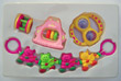 Descripción: Conjunto de cuatro juegos. Sobre el cartón hay un pictograma, relativo a la restricción de edad (6-18 meses) y marca «CE».