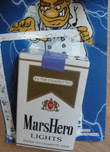Descripción: Artículo de broma con forma de paquete de cigarrillos que produce descarga eléctrica cuando se utiliza. Marca "MarsHero Lights".
