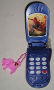 Descripción: Móvil de plástico, rojo y azul, equipado con una pequeña antena que parpadea y una cadena para colgar alrededor del cuello del niño. Funciona con 2 pilas de botón de 1,5 V. Imágenes de Spiderman.