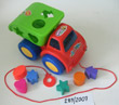Descripción: Camión de juguete con agujeros para la inserción de bloques. El juguete tiene un cordón rojo con un asa al final.