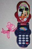 Descripción: teléfono móvil de plástico en forma de cabeza de Mickey Mouse, equipado con una pequeña antena transparente y una cadena para colgar alrededor del cuello de un niño. Funciona con 2 pilas de botón de 1,5 V.