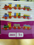 Descripción: Locomotora de madera con dos vagones, pintados en colores. Hay inscripciones en el envase, incluyendo: "Eichhorn", símbolo CE, datos sobre el fabricante.