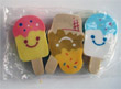 Descripción: Paquete con 3 gomas de borrar pequeñas en forma de helado. Tiene una etiqueta en el envase con marca CE y símbolo con respecto a la edad. Dimensiones: 5,5 x 3 x 1 cm.