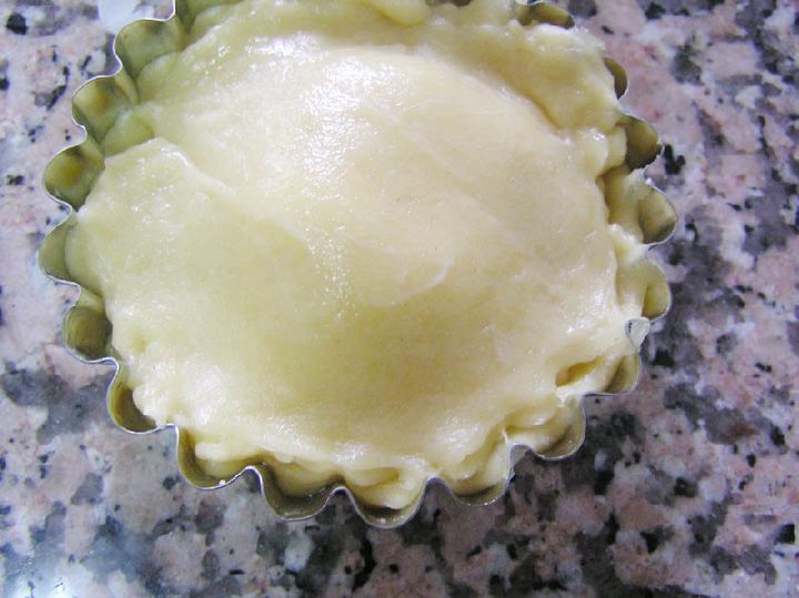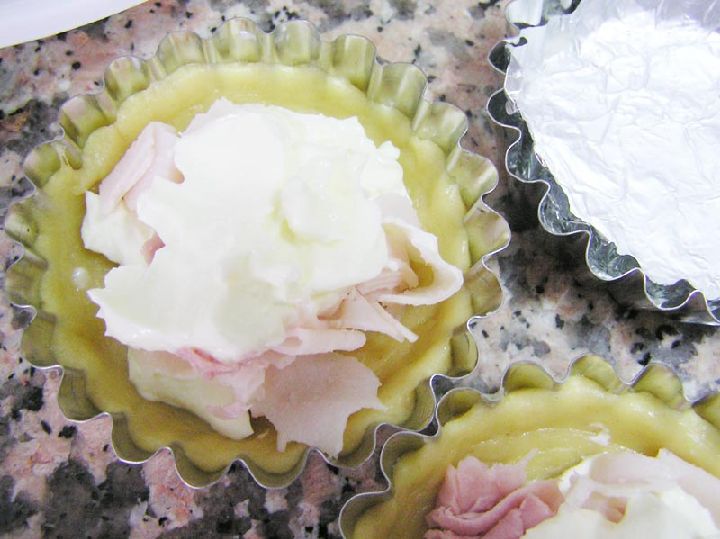Ya hecha la masa buscaremos unos moldes que untaremos con mantequilla y rellenaremos en su base con la masa preparada. Estas bases las rellenaremos con queso cremoso de untar y trocitos de jamón cocido.