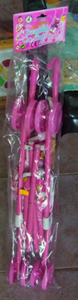 Descripción: Sillita de paseo con mecanismo de plegado, hecho de tubos de plástico con un diámetro de 13 mm. y remaches de metal, dispositivo de bloqueo de plástico que conecta las correas y asiento de tela .Lleva una etiqueta de color con la marca "Lovely Baby Barrow" en amarillo, y "Beautiful Go Cart" en azul, y recomendación de la edad.