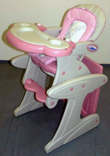 Descripción: Silla alta con una bandeja que ofrece varias posiciones. Tapizado en tela y PVC, respaldo regulable. Marca registrada, dirección del distribuidor, país de origen. Producto marcado con CE (no correcto). Las advertencias de seguridad están sólo en idioma checo.