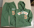 Descripción: Traje deportivo de dos piezas, colores: verde oliva, azul oscuro, azul claro, tamaño de 99 a 116, consistente en una sudadera con capucha rodeada por un cordón, cremallera y dos pequeños bolsillos, aplicación en el frente con la inscripción: "WNC 1982, 5", y en la parte inferior: pantalones con cordones en la cintura. En la parte izquierda hay un bordado con la inscripción "WNC" y sewed application "5". Hay etiquetas en las dos piezas con información sobre el contenido: algodón 75%, poliéster 25%, y los símbolos para el trato de la prenda. En la parte superior hay una etiqueta con el código de barras 8697845993486.