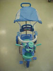 Descripción: Triciclo para niños de edades comprendidas entre 1 y 3 años, con una barra para empujar y una sombrilla plegable. El armazón está hecho de metal, las otras partes son de plástico. El manillar está dotado con una cabeza en forma de perro que emite un sonido cuando se empuja. Funciona con dos pilas de 1,5 V AA. Altura del asiento: aprox. 31 cm.