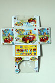 Descripción: Coche para niños pequeños que opera con pilas, los faros son los ojos y el parachoques la boca de una cara. Hay un payaso en el capó y un oso en el techo.