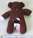 Descripción: Oso de punto marrón. Hay una etiqueta de tela blanca cosida en el oso con el nombre de la marca y el origen.