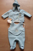 Descripción: Mono y chaqueta con capucha que contiene cordones con terminación de osos de plástico. Hay botones en los hombros y un conejo bordado en el frente. En el interior de la parte trasera hay una etiqueta, que tiene la siguiente información en idioma búlgaro: "Vis Vitalis", escrito en una bandera llevada por un oso, y el tamaño. En la parte trasera de la etiqueta: 100% algodón, con los símbolos para el correcto tratamiento de las prendas, "Producido en Bulgaria". En el interior hay una etiqueta textil idéntica a la de los pantalones, otra etiqueta se adjunta con un pin de seguridad, que tiene una imagen de un oso y un logotipo de la empresa. Empaquetado transparente con una etiqueta adhesiva de papel con el código de barras, "set" Fani ", t. tejido de punto acolchado, 100% algodón", y el tamaño.