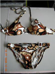 Descripción: Bikini elaborado a partir de tejido elástico, con patrones en color color beige, marrón y negro. Hay una hebilla de plástico blanco en la parte superior. Hay costuras negras que están directamente en contacto con el cuerpo.