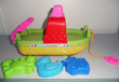 Descripción: Barco de plástico con ruedas en la parte inferior y cuerda en un extremo para tirar de él. El juguete también tiene tres moldes de cangrejo, pato y pez para hacer formas con la arena. Empaquetado con una etiqueta que muestra un cuadro de un bebé que juega con la arena, marca de CE, hecho en China y un pictograma que indica que el juguete no se recomienda para niños menores de 3 años.