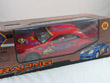 3. Coche deportivo de plástico de color rojo por control remoto (escala 1:10) con motivos de color en el lateral (una calavera, etc) y neumáticos negros.